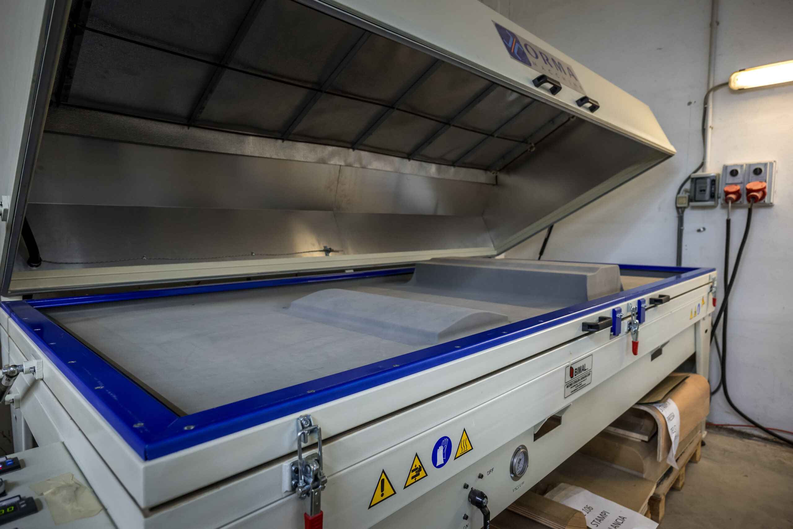 Aspirazione: l’impianto di depressione crea un vuoto, facendo aderire il telo di caucciù all’oggetto in modo uniforme, come se avvolgesse tutto ciò che trova